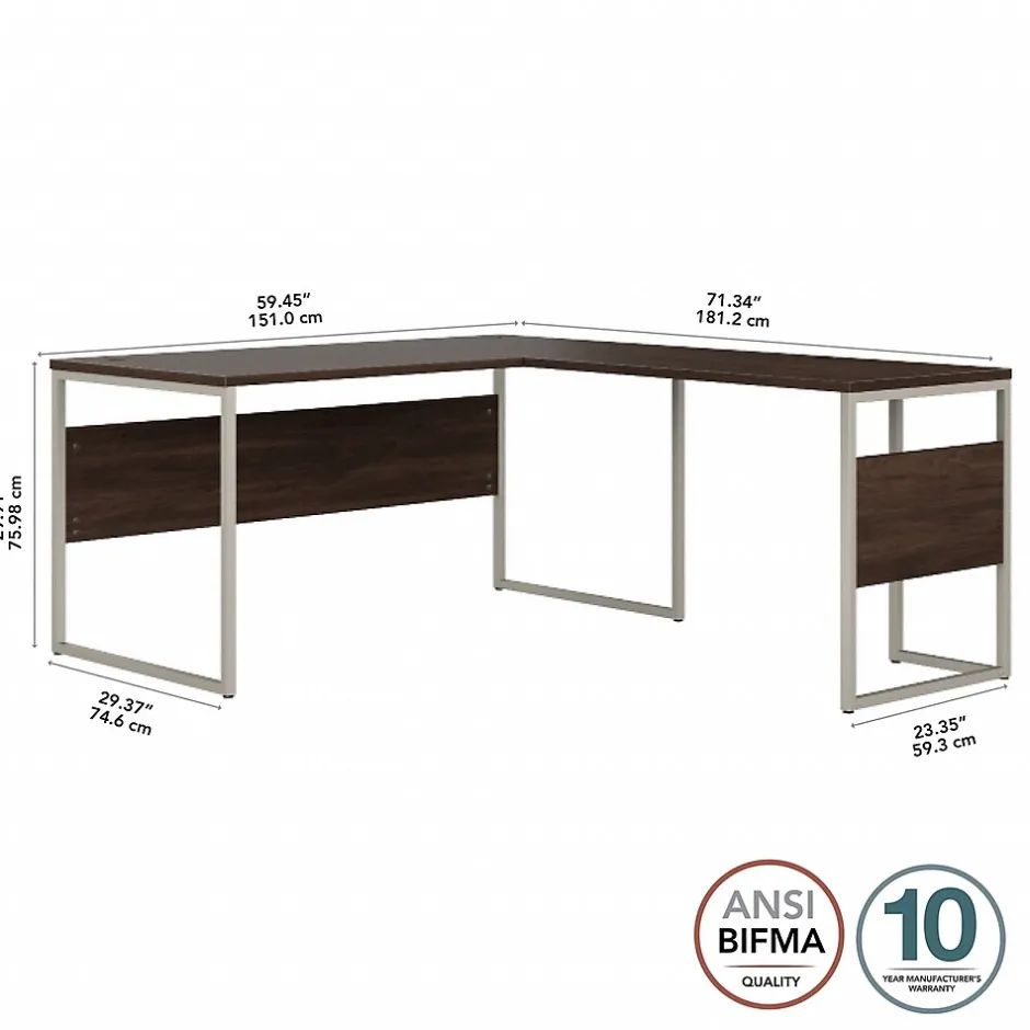 The Bush Business Furniture Hybrid L-shaped table desk blends a durable work surface with sturdy metal legs to offer a stylish, long-lasting solution for the modern professional. Tackle your next project or assignment with a computer, books, and more on a desktop that supports up to 200 lbs. Three built-in wire management grommets keep cords and cables in order, so your work area remains free from unnecessary clutter. The corner desk’s open leg design and finished privacy panel allows it to look great facing any direction in a home or professional office environment. This modern computer desk has been meticulously tested to meet or exceed the ANSI/BIFMA standards for safety, durability, and performance and is backed by a 10-year manufacturer warranty. American-made with US and imported parts.