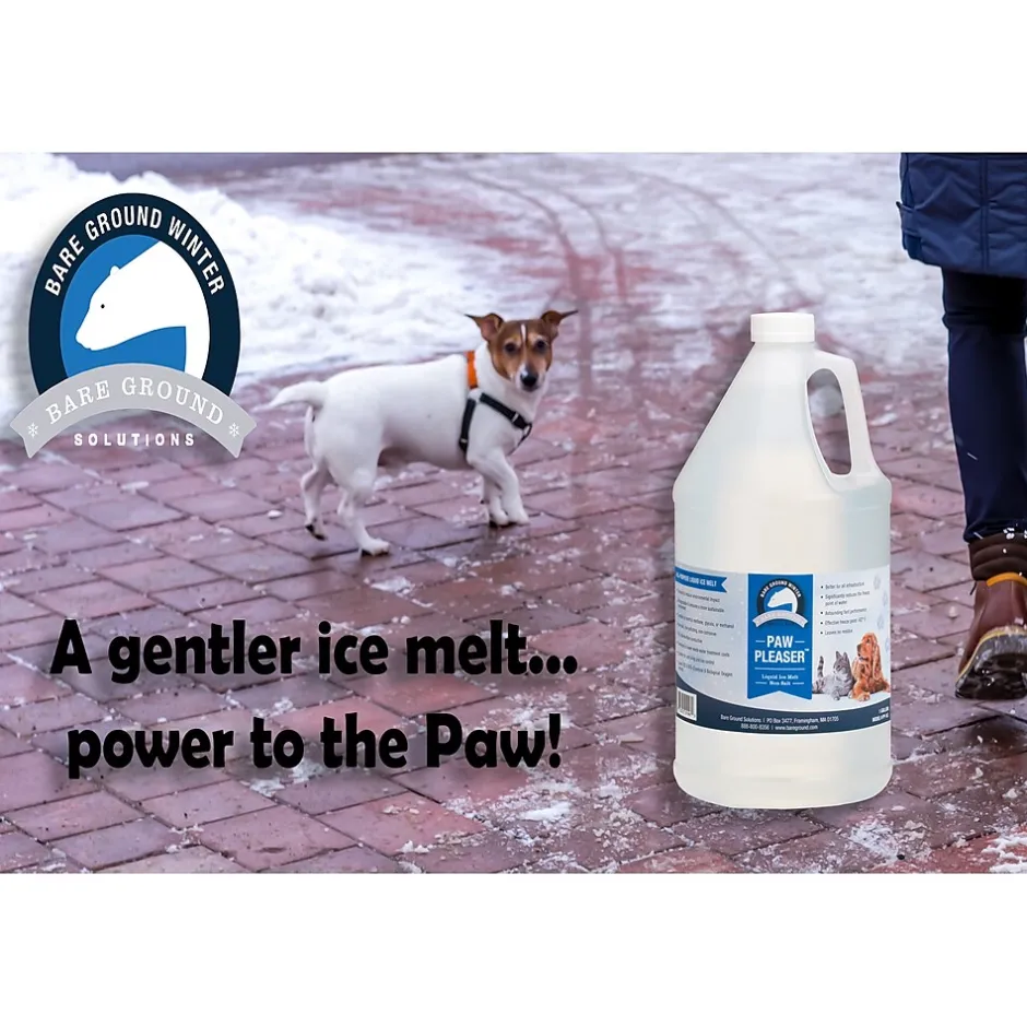 Paw Pleaser one gallon liquid ice melt is a unique blend of 2 different 100% non salt formulations each containing no harsh chemical chlorides. Specifically designed to reduce all environmental impacts. Paw Pleaser is completely pet safe and harmless around children and contains no harmful methans, glycols or methanol. Paw Pleaser will not cause harm to eyes, paws or fur. Paw Pleaser is a non toxic, non corrosive and non polluting formulation. Paw Pleaser runoff actually can boost lawn growth. Safe on all surfaces. Effective to 10F. Paw Pleaser can be sprayed during or after a snow or ice event using any conventional sprayer with an adjustable nozzle. Coverage is 1000 sq ft per gallon.