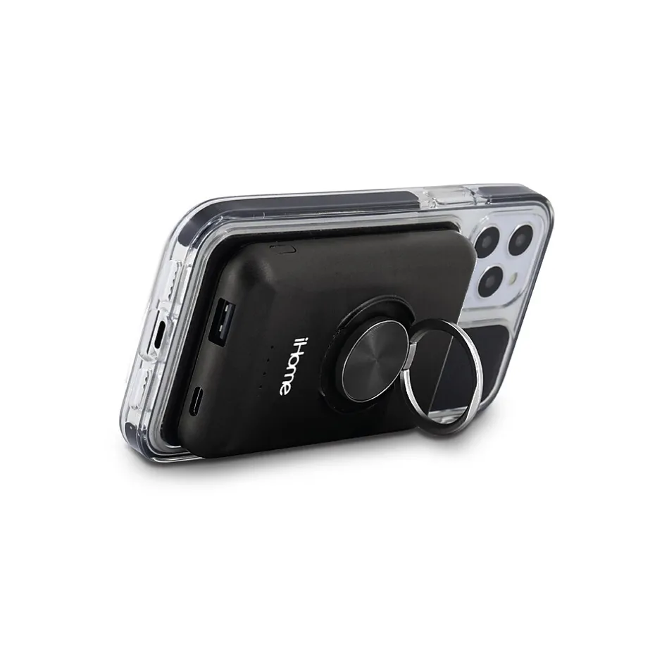 The iHome portable magnetic powerbank with ring stand and 15W fast charging delivers true wireless charging on the go. Snaps directly to the back of iPhone 12/13 series or any MagSafe compatible case. Includes a rotatable kickstand ring. Built-in safeguards protect against overheating to provide safe charging.