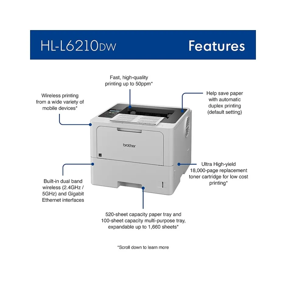 The Brother HL-L6210dw business monochrome laser printer is a great choice for busy offices and workgroups with higher print volumes that need fast, high-quality output, low-cost printing, large paper capacity, and advanced security features. This high-performance printer helps increase productivity with a fast print speed of up to 50 ppm(1). The printer delivers low-cost printing by using the Brother TN920UXXL genuine ultra high-yield replacement toner cartridge. Triple-layer security features help limit document and device access and protect against network intrusions. Offers a large, expandable paper capacity that is scalable as your business needs grow. The HL-L6210dw also provides flexible connectivity with built-in Gigabit Ethernet and dual-band wireless networking, plus convenient mobile device printing to meet mobile workforce demands(2).