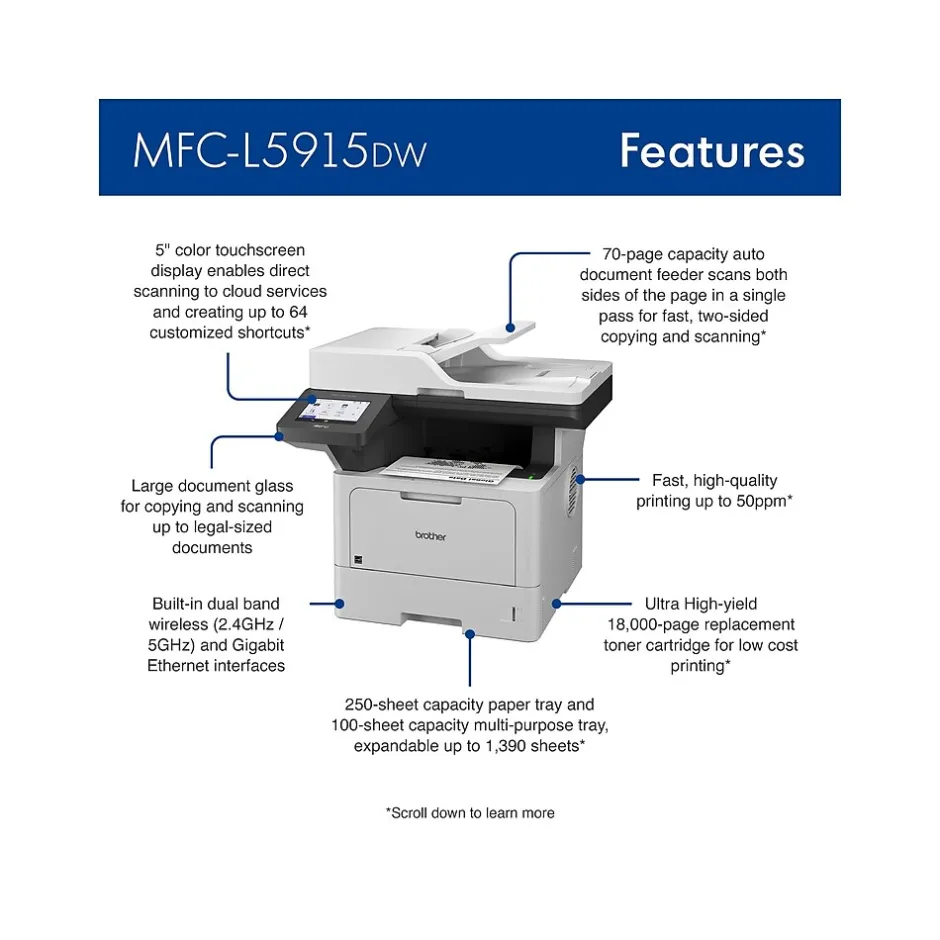 The Brother MFC-L5915DW business monochrome laser all-in-one printer is a great choice for busy offices and workgroups with higher print volumes that need low-cost printing, versatile paper handling, advanced security features, and reliable output. Helps to increase productivity with fast print and copy speeds up to 50ppm(1). Delivers cost-efficient printing by using the Brother Genuine TN920UXXL ultra high-yield replacement toner cartridge. Fast scanning to popular destinations directly from the touchscreen display. Triple Layer Security features help to limit document and device access and protect against network intrusions. Expandable paper capacity. Built-in Gigabit Ethernet and dual band wireless networking, plus convenient printing from and scanning to mobile devices(3).