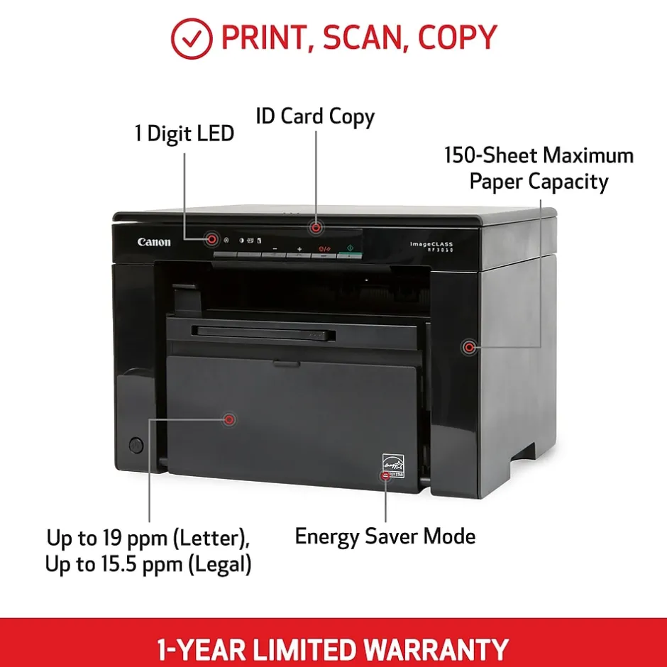 The Canon imageCLASS MF3010 Value Pack is designed to add value to your home office. Print, scan, and copy with a compact design that fits anywhere in your workspace, and the generous yield of up to 2,300 pages in the box helps you print longer.