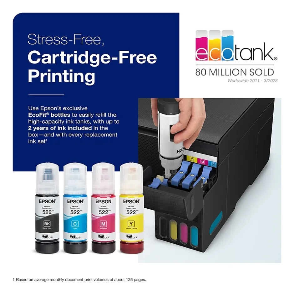 - High-Capacity Ink Tanks – Epson’s exclusive EcoFit ink bottles make filling easy and worry-free