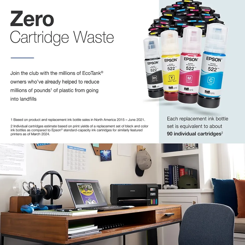 - Zero Cartridge Waste – By using an EcoTank printer, you can help reduce the amount of cartridge waste ending up in landfills