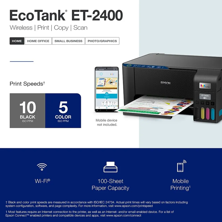 You’re looking for an easy-to-use Supertank printer that will get the job done. That’s why we developed the EcoTank ET-2400 – an innovative cartridge-free solution that uses high-capacity, easily refillable ink tanks. So you’ll worry less about running out of ink, and save a lot on replacement ink. The ET-2400 features genuine Epson print quality and a high-resolution flatbed scanner – making it a convenient choice for essential, everyday home printing.