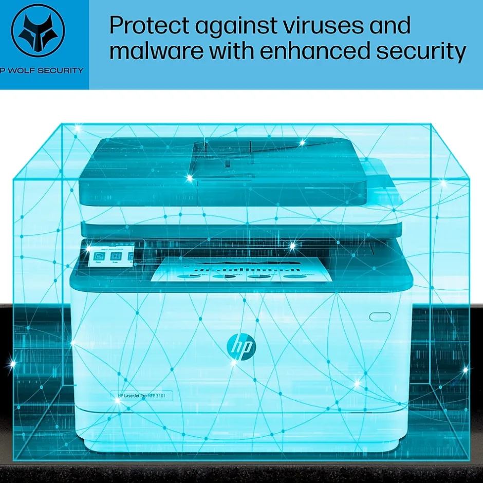 Ideal for small teams, get high-quality printing and powerful productivity with the LaserJet Pro MFP 3101sdw. This all-in-one laser printer is loaded with features and incredible speed perfect for offices. Print, scan and copy from anywhere with HP app. Connect via wireless or ethernet with the 3101sdw, a printer that has built-in Wi-FiĀ® and HP Wolf Pro to keep your information secure.