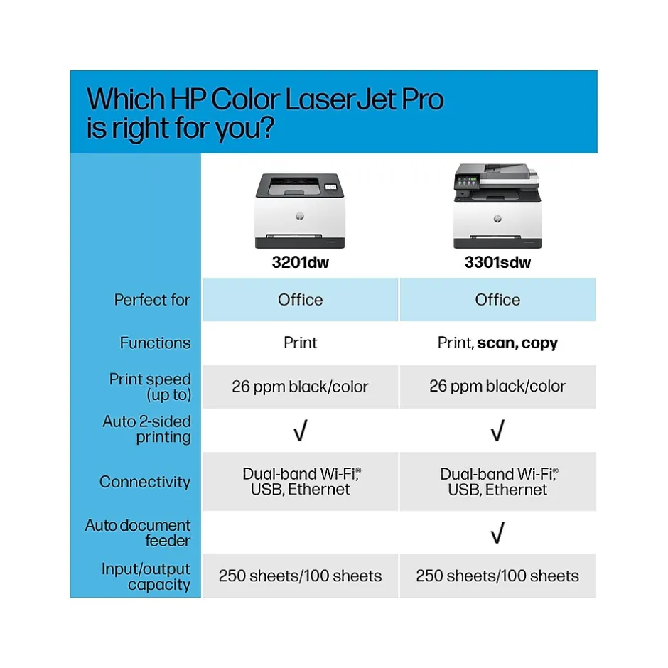 Ideal for offices, get vibrant laser-quality color and powerful productivity with the Color LaserJet Pro MFP 3301sdw. This all-in-one color laser printer is loaded with features and incredible speed perfect for offices. Print, scan and copy from anywhere with HP app. Connect via wireless or ethernet with the 3301sdw, an mfp that has built-in Wi-FiĀ® and HP Wolf Pro to keep your information secure.