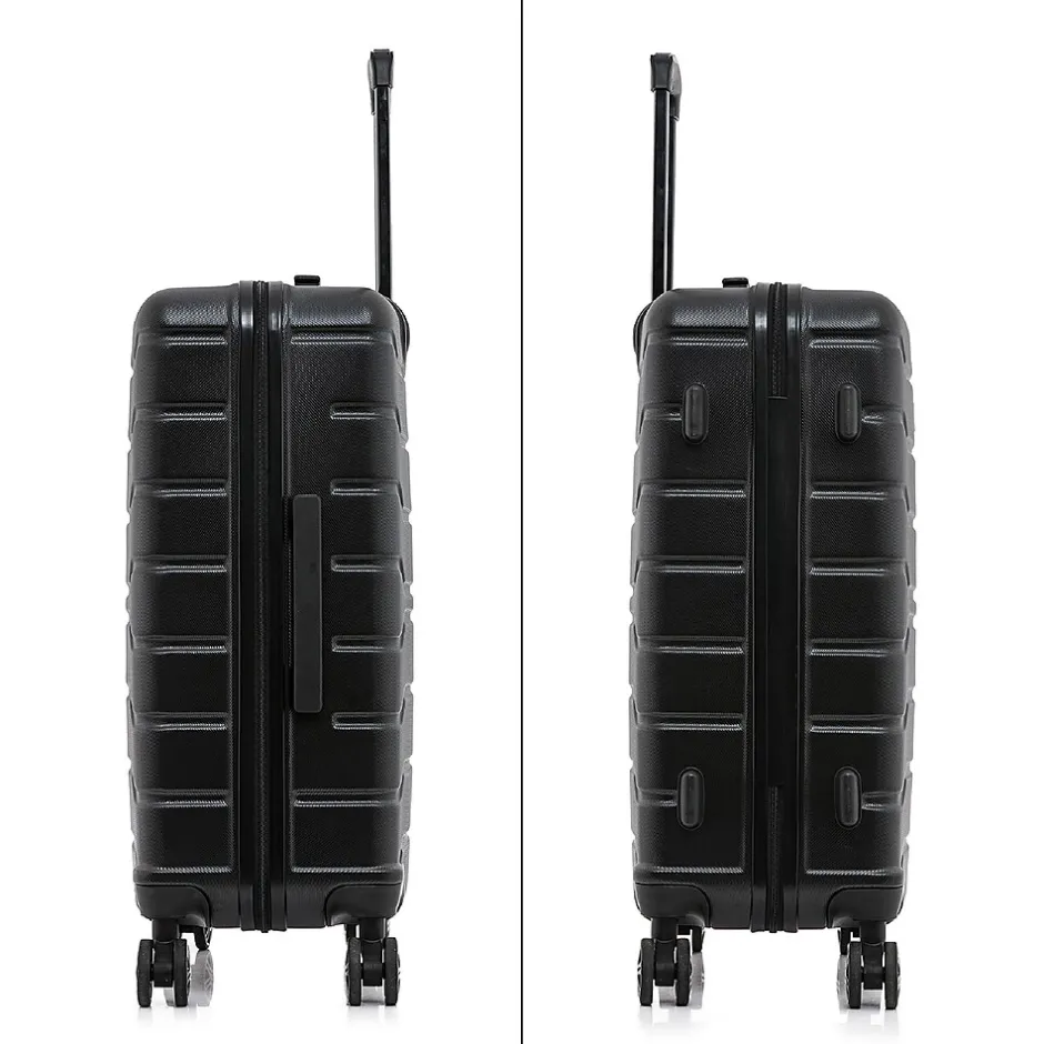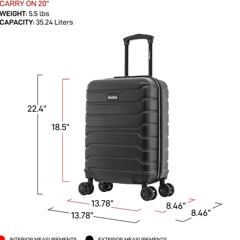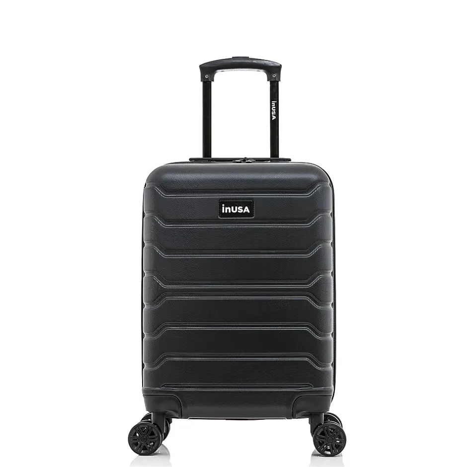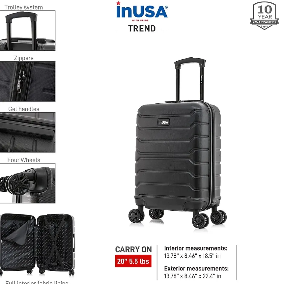 Improve your travel experience with this InUSA Trend carry-on luggage. Made of lightweight PC/ABS engineered material with a brushed finish, this luggage features a push-button locking internal retractable trolley system and four dual 360-degree silent spinner wheels for smooth, effortless mobility. The hard-flex construction offers maximum strength, durability, and resistance to water and scratches. Four side studs let the luggage stand on its side, while the top ergonomic gel handles provide comfortable and easy lifting.