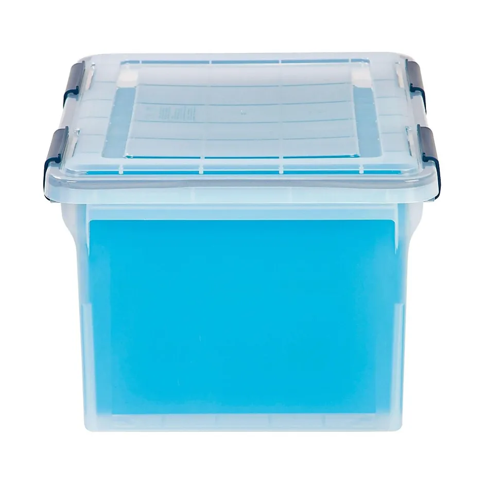 Store file folders neatly away inside this plastic file box. The snap-shut lid keeps dirt and dust away, while the clear construction lets you view the contents inside. A reinforced lid makes it easy to stack multiple units for a space-saving storage option. This Iris Ultimate file box accommodates both letter- and legal-size file folders for added versatility.
