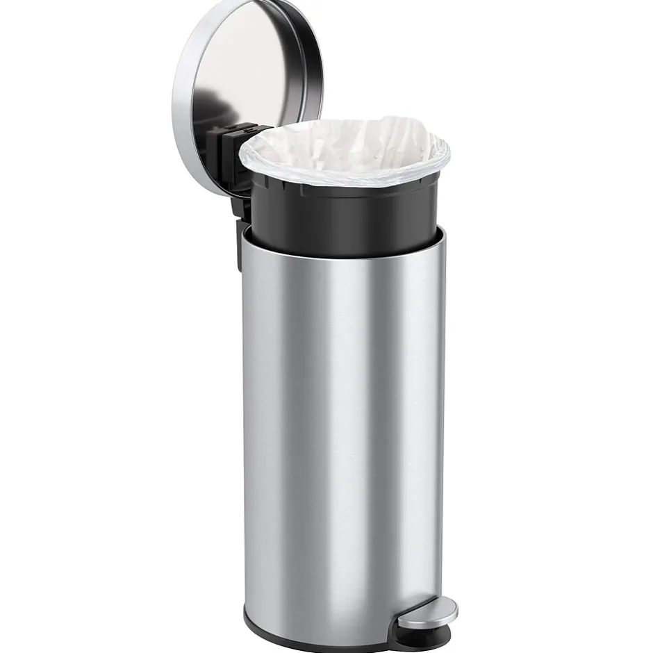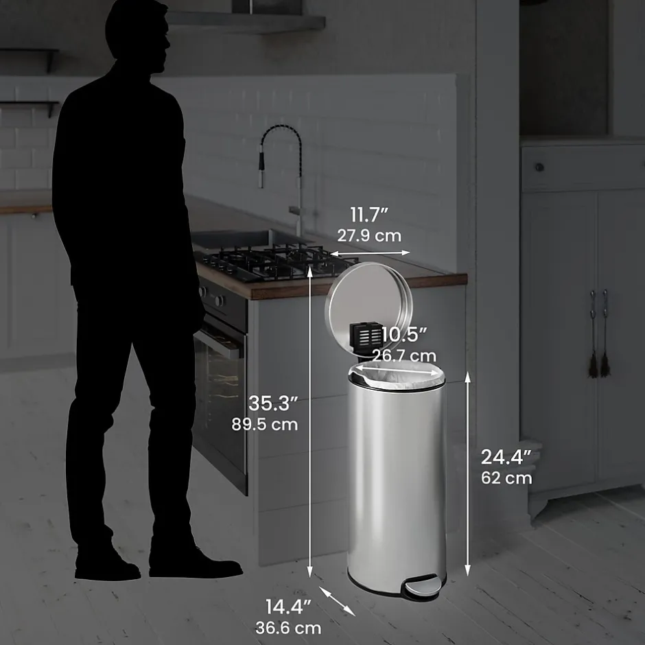 - Round step trash can ensures clean and litter-free space and provides hands-free operation