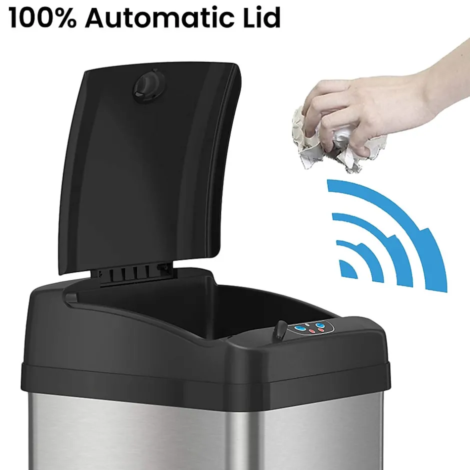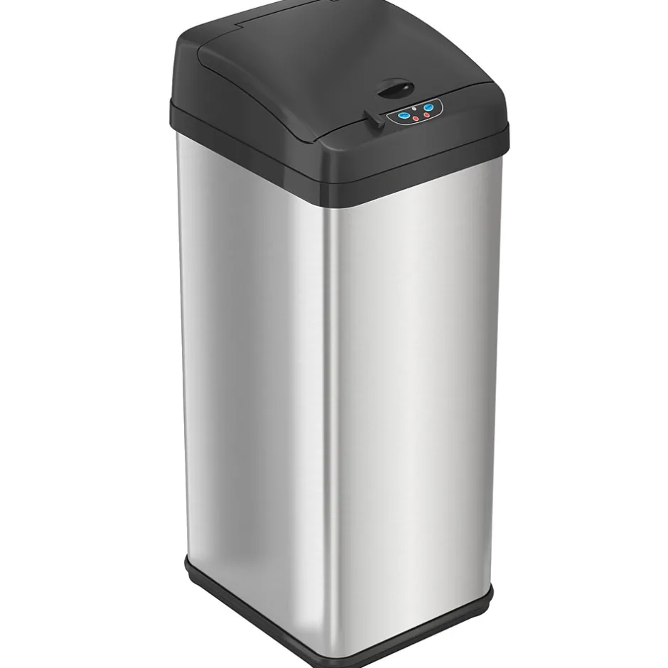 - Sensor-activated, automatic lid. High-quality ABS plastic. Powered by four D size batteries (not included) or AC Adapter (sold separately).