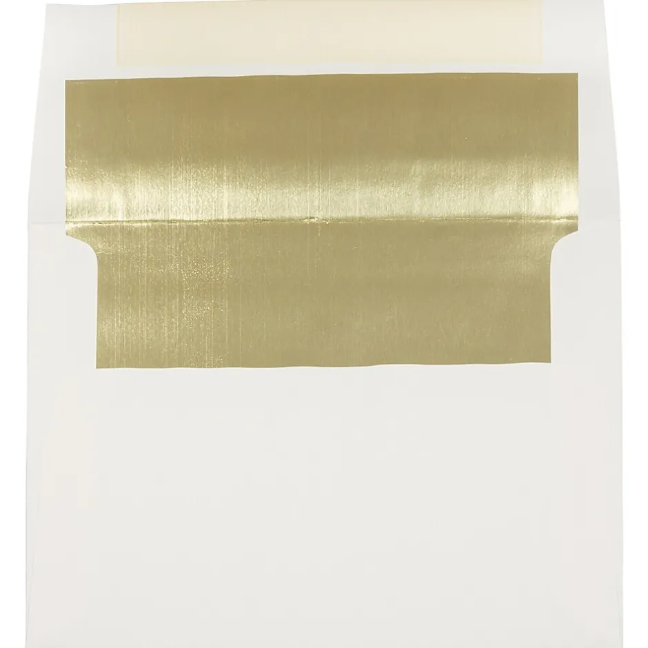 JAM PaperĀ® Ecru with Gold Foil Lining A7 Foil Lined Invitation Envelopes measure 5.25 x 7.25 inches in size and are made out of high quality, smooth, 24lb paper. This pack contains a total of 50 envelopes. All of the envelopes in this pack features an elegant ecru color and a beautiful, shimmering gold lining on the inside! The size of these envelopes makes them perfect for standard sized invitations and greeting cards while their appearance makes them excellent for formal events and occasions! Use these envelopes to mail out invitations to weddings, bridal showers, galas, engagement parties, dinner parties, fancy birthday celebrations, and more!
