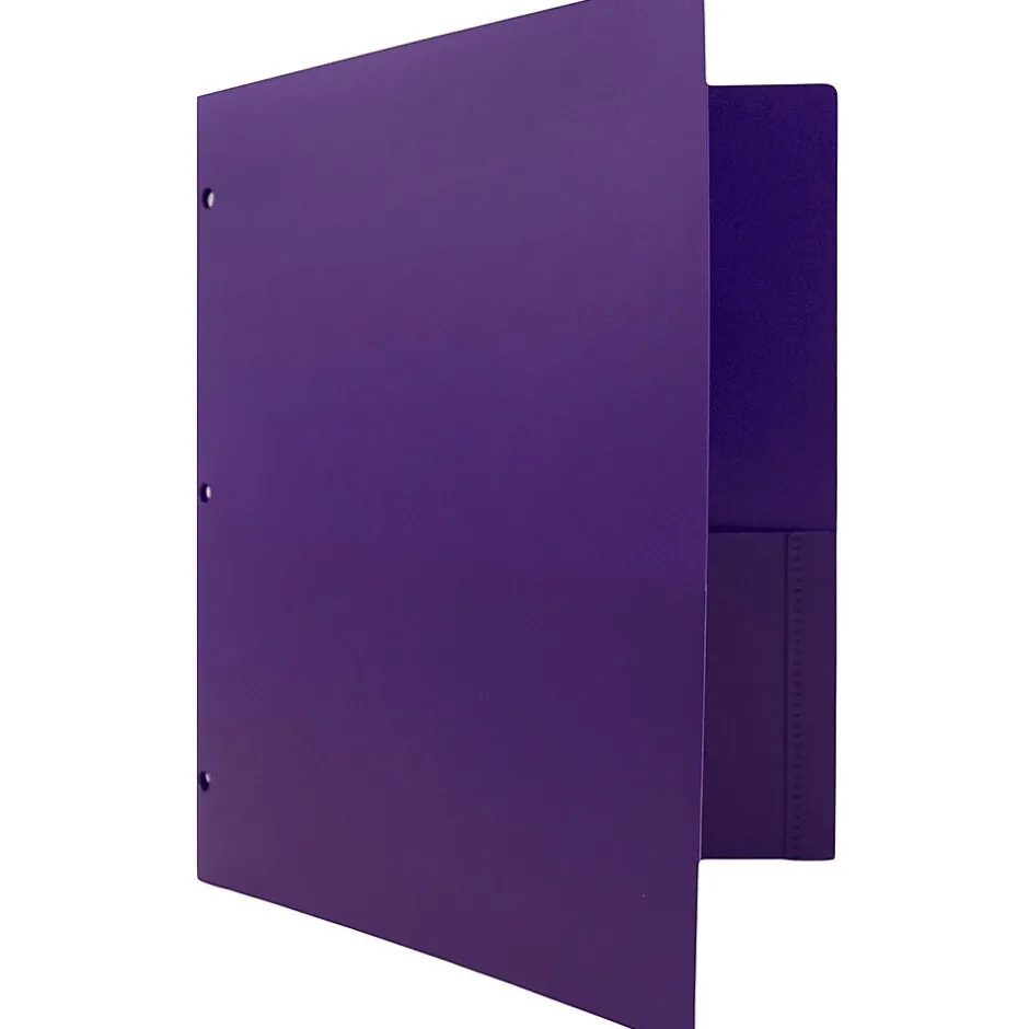 JAM Paper ® Purple Plastic Two Pocket 3 Hole Punched Presentation Pocket School Folders are made out of heavy-duty plastic and feature 3 holes along the edge on the left side for placing them into 3-ring binders! Each one features 2 pockets on the inside and a business card sized slot cut into the right side pocket. Ideal for standard sized documents, these folders measure 9 x 12 inches each. This pack includes an even total of 6 folders! Their bold purple color is sure to serve as a welcome accent and inspiration in your work space. Use them for projects, notes, class handouts, important documents and more!