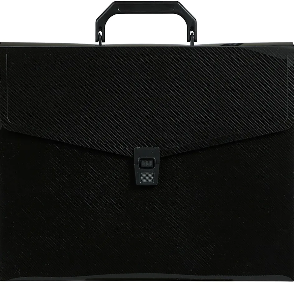 JAM PaperĀ® Black Plastic Portfolio Briefcase with Handles measures 12 x 9.5 x 1.5 inches in size and is made out of smooth, durable poly plastic. Featuring a solid black color, this case will appear professional in any office or academic setting and will keep the contents inside of it hidden from sight. To make carrying it from place to place simple and easy, this portfolio has a black plastic handle. It opens up in the front with a vflap and closes with a black plastic closure. This case is sold individually. Use it to store, protect, and carry your important documents. Whether you need to carry files to your office, spreadsheets to that next meeting, or advertising materials to a sales call, this portfolio will help you get the job done.