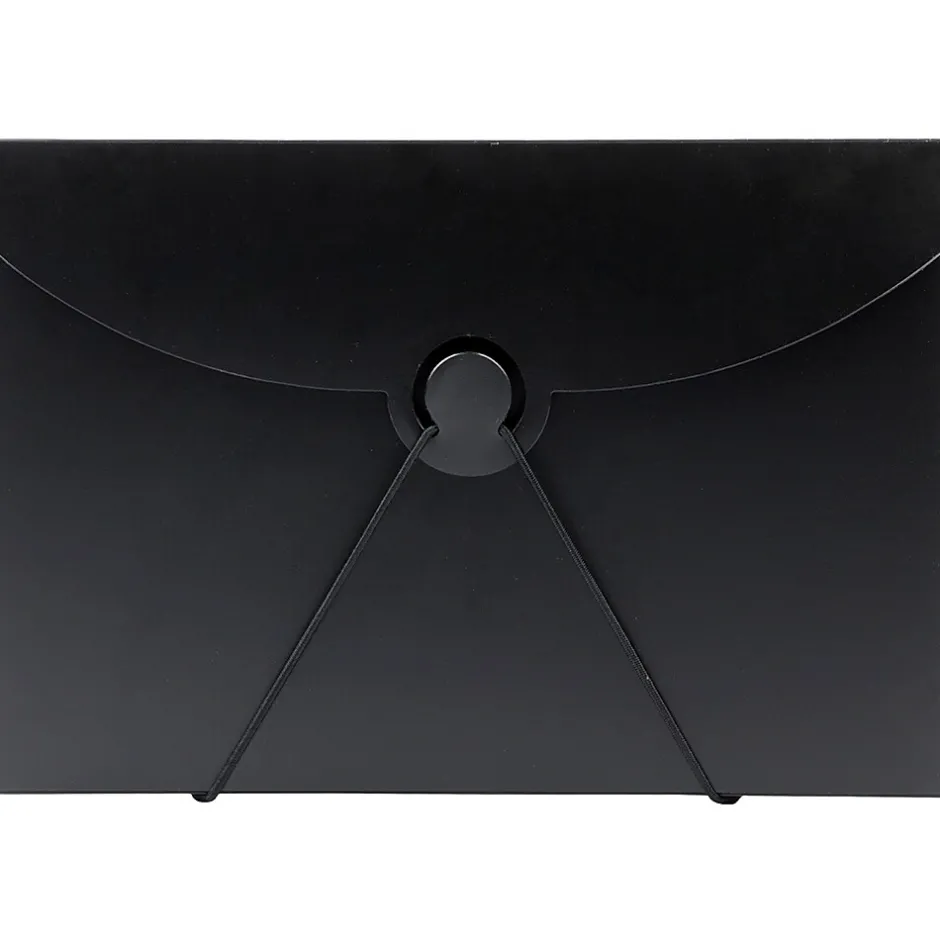 JAM PaperĀ® Black Large Plastic Portfolio with Hook Closure is a great choice for storing, protecting, and carrying standard letter sized sheets of paper around your office, into the board room, or into the class room! This portfolio measures 9.5 x 12 x 0.25 inches in size and is made out of smooth durable poly plastic. Sold individually, this portfolio is black and has a rounded flap opening with a round tab at the end. A black strand of elastic string that is attached to the back on the bottom stretches from the bottom upward and loops around this tab to keep the portfolio closed. Use this versatile portfolio for your important documents, projects, notes, and more!