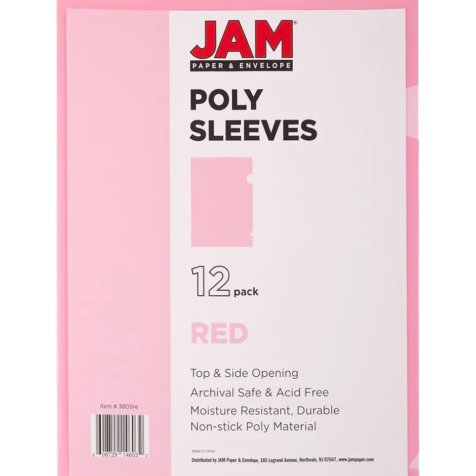 JAM PaperĀ® Red Plastic Sleeves are made from durable, pliable, acid-free, moisture resistant, nonstick, semi-transparent plastic. This pack contains 12 sleeves. Each one measures 9 x 11.5 inches in size, making them ideal for standard sized documents. The left and bottom edges of these sleeves are sealed closed. The top and right side edges are open in order to allow you to slide documents in and out of the sleeve. The right edge also features two indented notched to help you lift the top cover to fit documents inside. These sleeves feature a light, pinkish red color that stands out and helps you color categorize your documents. The semi transparent plastic allows you see and read documents from the outside.