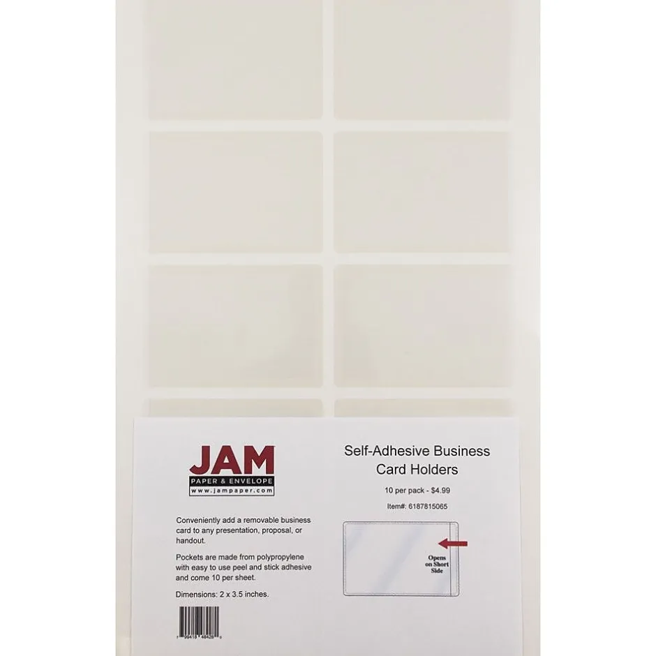 Conveniently add business cards to presentations or proposals with Self Adhesive Business Card Holders by JAM Paper® featuring easy-to-peel and stick adhesive for ease of locking and polypropylene material for protection from wears.