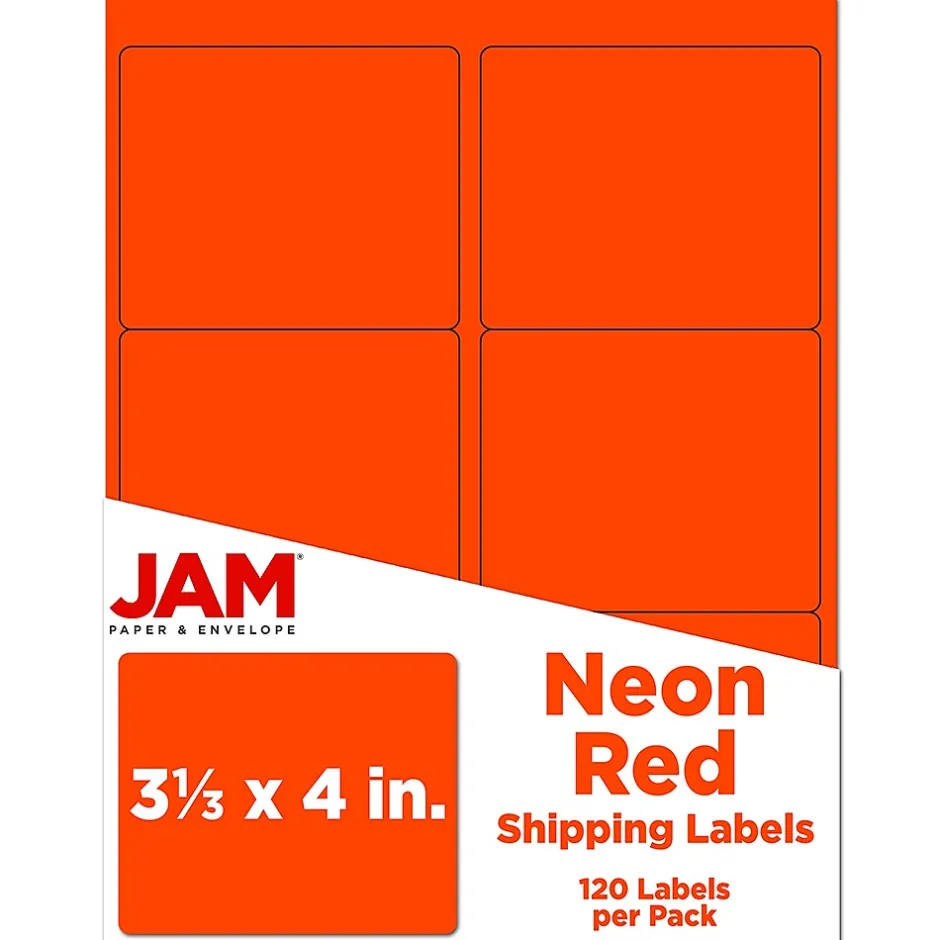 JamĀ® 3 1/3″ x 4″ address label in neon red color is constructed from smooth paper and easy to peel/stick. Rectangle label is compatible with printing and a bright/bold way to dress up an envelope, sold as 120 labels with 6 per page.