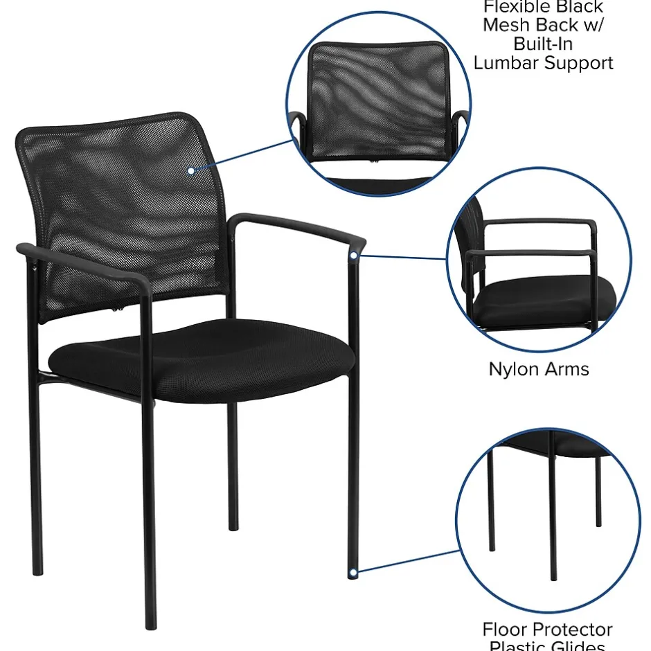 The sleek lines of this black mesh side chair add distinctive style and surprising comfort to your office, home or reception area. A flexible mesh back allows air to circulate, keeping you cool, while built-in lumbar support reinforces healthy posture, reducing back strain and muscle fatigue. The contoured seat cushion has a full 2.5 inches of padded foam, covered with black mesh upholstery. The steel tubular frame has a smooth black powder coat finish for easy maintenance. Plastic floor glides protect your floor by sliding smoothly, allowing you to easily rearrange the chairs, as often as you like. And these lightweight chairs can be stacked up to 5 high to transport and store. Line up some chairs for a uniform look in your training room, reception area or lobby, or use one in your office as a guest chair.