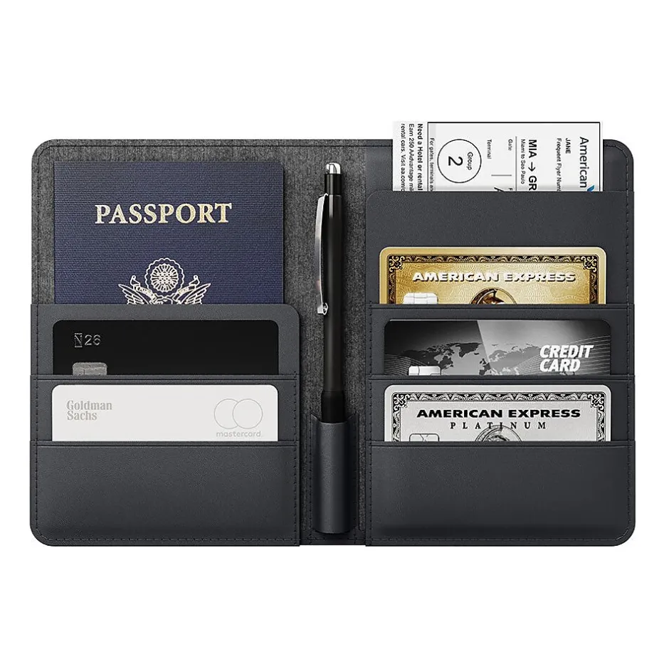 - Features five card slots, a passport pocket, a boarding pass pocket, a pen holder, and a hidden money pouch