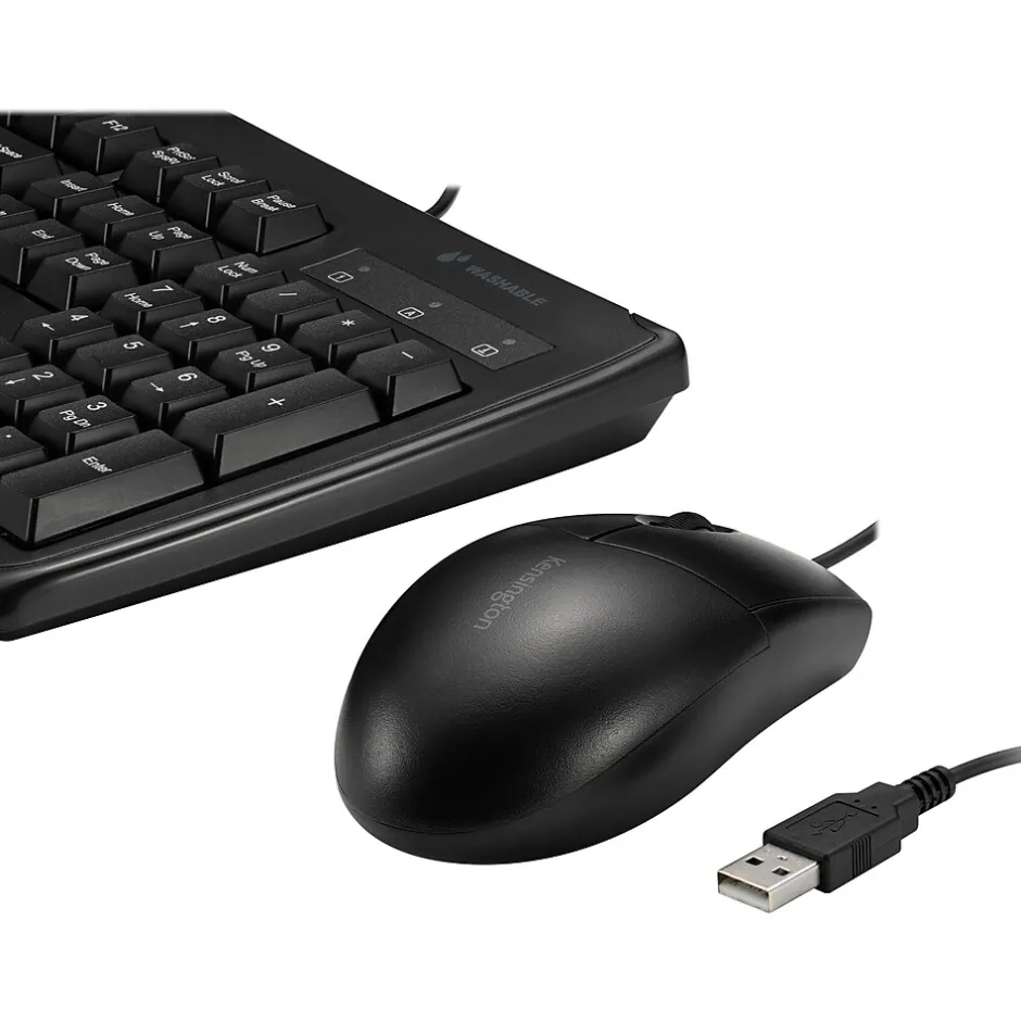 The Kensington Pro Fit wired washable keyboard and mouse set, with its waterproof, easy-clean, rugged design, is perfect for maintaining a hygienic surface and cleaning up drips and spills without sacrificing performance. The IP67 mouse rating and IPX6 keyboard rating mean this set can easily stand up to frequent cleaning with water and solvents. The full-size, six-row, 104-key keyboard includes a numeric keypad, and laser-etched keys feature highly readable letters that won’t wear off. The ambidextrous, contoured mouse with a three-button scroll wheel provides a comfortable experience for left- and right-handed users. The high-definition 1600 DPI optical sensor tracks the mouse’s movements with smooth accuracy for optimal performance and productivity. Wired USB connection delivers reliable performance without the need for batteries. Plug and play, so there’s no software to download and install. Perfect for home, office, education, hospital/medical environments, or retail.