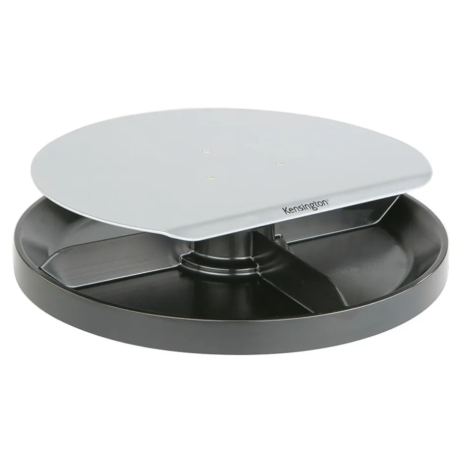 - The patented, spinning multi-compartment storage area underneath the platform provides easy access to your most-used desktop tools and accessories