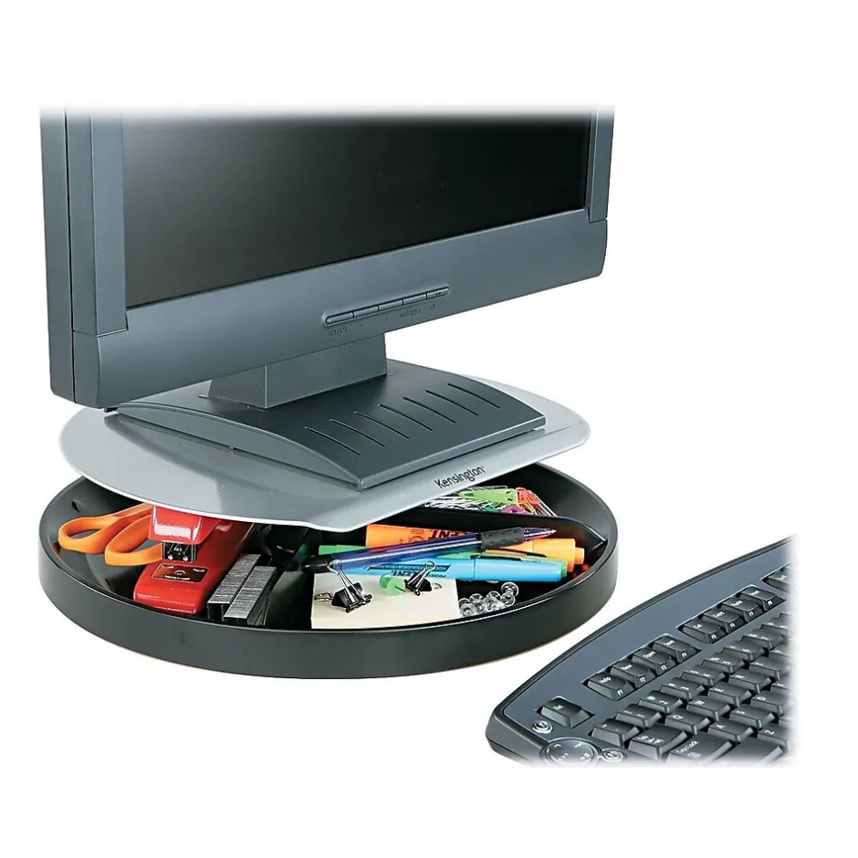 Raise a screen to its ideal viewing height when using this stand, which swivels to elevate monitors up to 3.3 inches above the desk. This stand also includes an organizational compartment to keep frequently-used tools accessible. This Kensington Spin2 monitor stand can hold monitors weighing up to 40 pounds.
