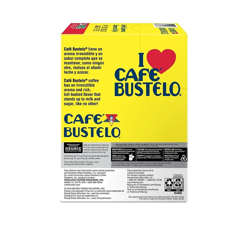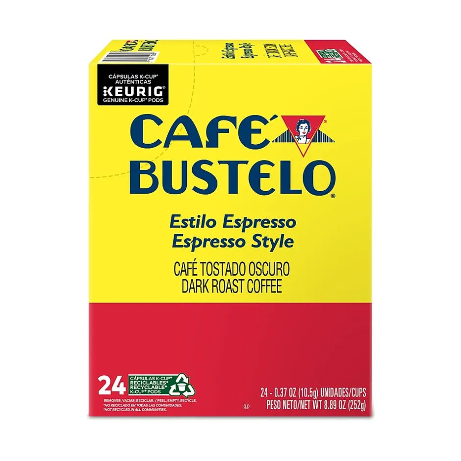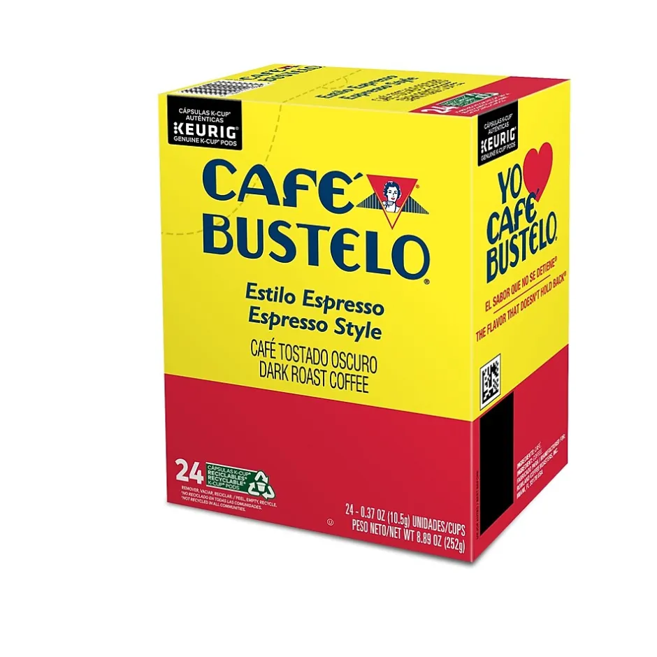 Stock the office coffee station with this Keurig K-Cup Cafe Bustelo espresso coffee 24-pack, and deliver the rich, bold taste of dark-roast beans to clients and staff. These individual coffee pods brew one at a time, cutting down on wasted grounds and eliminating mess around the machine. This smooth, rich Keurig K-Cup Cafe Bustelo espresso coffee 24-pack is excellent served black or with cream and sugar.