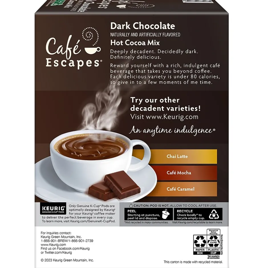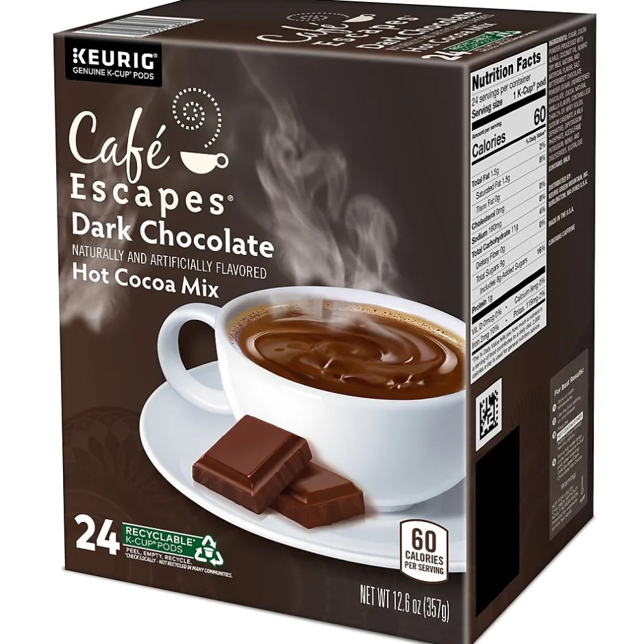 Give staff and visitors to your business a tasty way to stay warm with these hot cocoa pods. Rich flavor and just a hint of sweetness make this hot cocoa a satisfying hot beverage option, while the single-serving pods mean there’s no water to boil before pouring a cup. These Keurig K-Cup Cafe Escapes hot cocoa pods are easy to use for fast, delicious results.