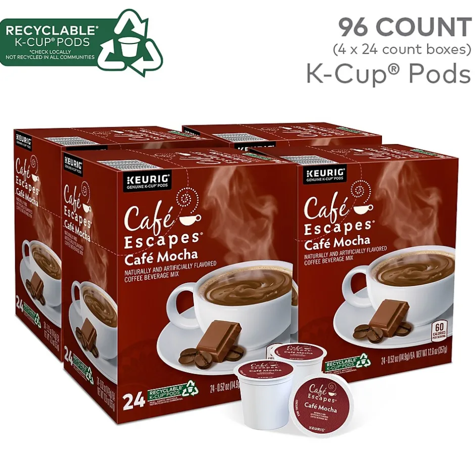 Cafe Escapes® Keurig® K-Cup® Cafe mocha is a blissful balance of coffee and cocoa savoring sweet with milk, soy, tree nuts and highly refined coconut oil. Cafe mocha is trans fat and gluten free for a rich and creamy flavor.