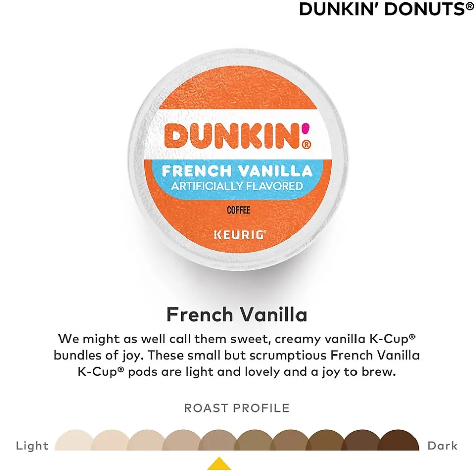 Enjoy the delicious taste of this French vanilla coffee blend. This 22-count box of Keurig K-Cup Dunkin’ pods provides enough brew to fuel a party, and the lively taste from 100 percent Arabica beans is a great way to start the day. The great tasting flavors and roasts from Dunkin’® are now available in convenient Keurig® K-Cup® pods. The same delicious coffee served in Dunkin’® restaurants is now available for your office with the same consistent taste and recipe used for over 60 years.
