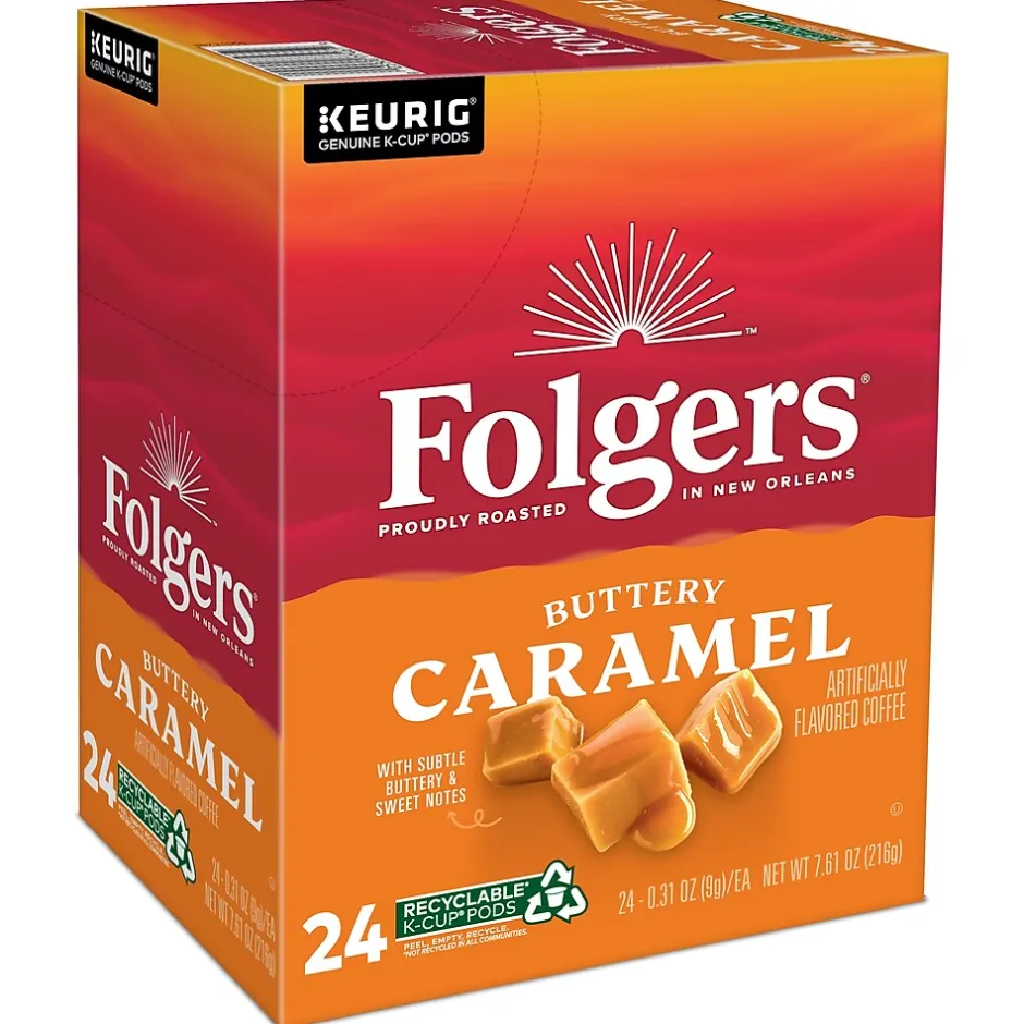 Reward your hard work with a delicious hot beverage when you use these Caramel Drizzle coffee pods. The medium-roast beans offer full-bodied flavor, while the creamy, buttery taste adds a gourmet finishing touch to every cup. This 24-count pack of Keurig K-Cup coffee pods lets you brew single cups, making them ideal for use in a break room, kitchen, or reception area.