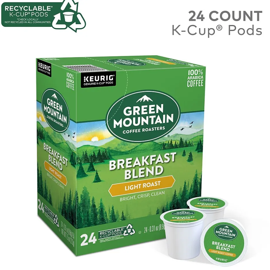 Place this 24-pack of Keurig K-Cup Green Mountain Coffee Roasters breakfast blend next to the office single-serve coffee machine for a mess-free way to offer a hot beverage. Each individual cup contains one serving of the light, nutty blend, eliminating the need for measuring and spilling coffee grounds. This convenient multipack of Keurig K-Cup Green Mountain Coffee Roasters breakfast blend is a great option for stocking up the office. An eye-opener as delightful as the dawn itself. Clean and bright, with balanced sweetness, nutty flavor, and a silky mouthfeel.