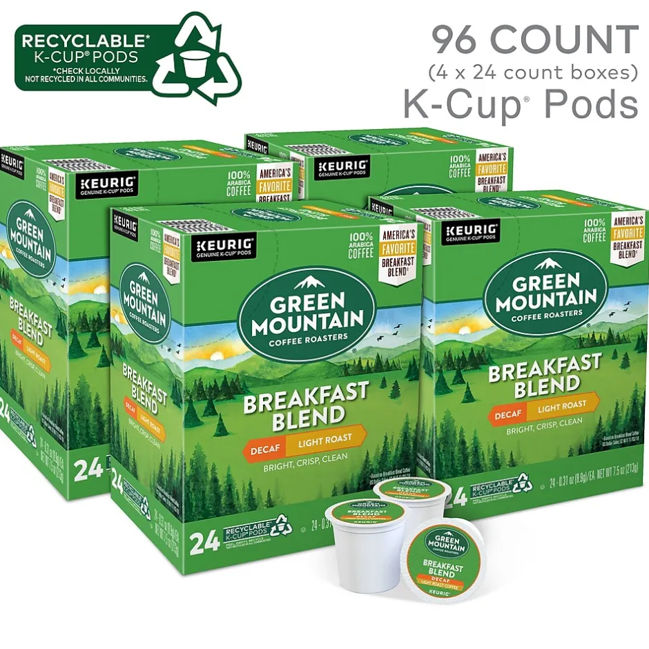 Enjoy silky-smooth texture from these decaf coffee pods. The nutty and sweet flavors blend together to provide a high-quality experience, and the pod design makes it simple to brew individual cups. These Keurig K-Cup Green Mountain Coffee Breakfast Blend coffee pods are decaffeinated, letting you experience all the taste without the buzz and jitters.