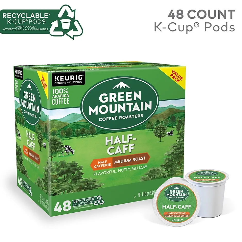 Get the energy you need while lowering caffeine intake with these Half-Caff coffee pods. With 48 in a pack, these coffee pods give you more than enough to stock up your supply for the home, lobby or break room. These Green Mountain Coffee Roasters coffee pods offer a mellow medium-roast base and feature touches of raisin and chocolate, providing a nutty, smooth finish.