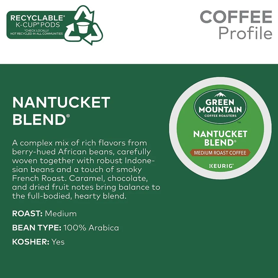 Start your morning with an energy boost from these Green Mountain Nantucket Blend coffee pods. Each pack contains 96 pods to make stocking up break rooms, waiting rooms or your home easy. These Keurig K-Cup Green Mountain Nantucket Blend coffee pods feature a hearty blend of caramel and chocolate with hints of dried fruit to create a beverage that wakes you up.