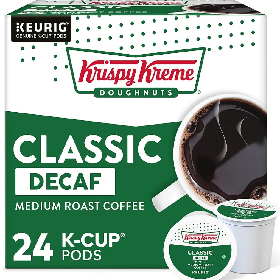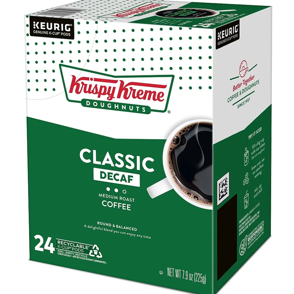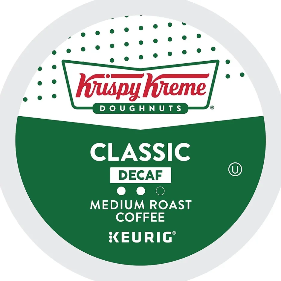 Brew a cup of this Krispy Kreme Doughnuts medium roast decaffeinated coffee at home or in the workplace. Individual portions ensure each cup produces a rich, balanced flavor and delightful aroma . These Keurig K-Cup Krispy Kreme Doughnuts decaffeinated coffee pods let you make a single portion at a time, so they’re ideal for waiting rooms and break rooms.