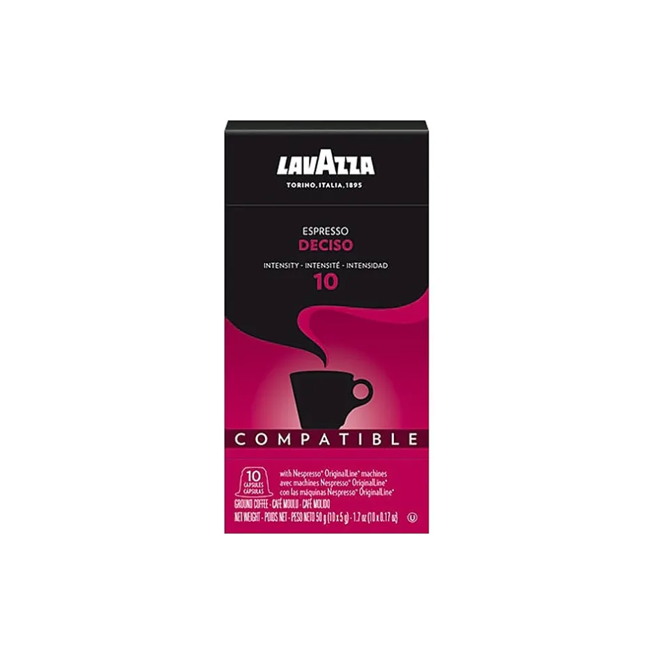 Lavazza Espresso Deciso is born out of the combination of Brazilian and Southeast Asian beans: a soft and full-bodied Brazilian coffee with oriental notes of cocoa and wood for a blend of intense and velvety flavors. The coffee capsule is compatible with Nespresso Original machines.