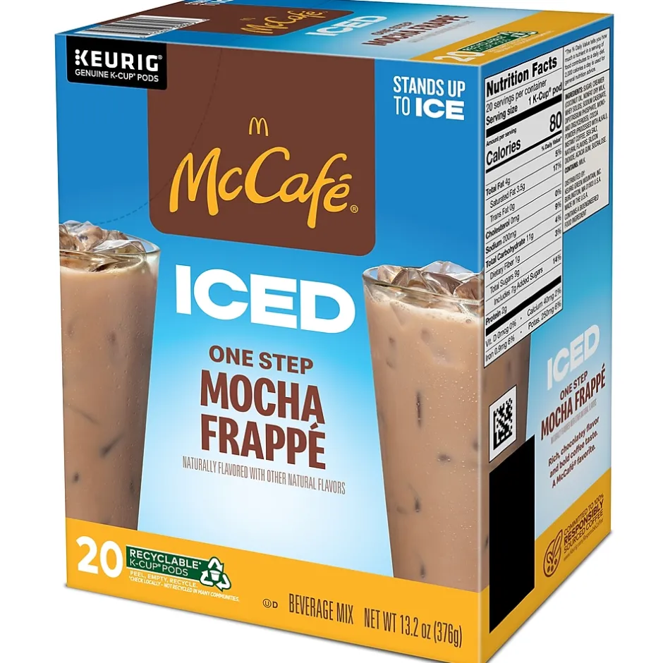 Inspired by McDonald’s McCafe specialty coffees, now you can enjoy the rich chocolaty flavor and bold coffee taste of the McCafe iced Mocha Frappe right in your kitchen. Bold, sweet, and creamy, the one-step Mocha Frappe gives you the best of McDonald’s McCafe specialty coffees in your cup, just how you like it. An all-time McCafe favorite, this deliciously refreshing iced coffee beverage is bursting with rich, chocolaty flavor and bold coffee taste. This coffee is made to stand up to ice. Each K-Cup pod is filled with rich coffee, natural flavors, sweetener, and real dairy, all in one, so you can enjoy your deliciously flavorful McCafe iced Mocha Frappe at the push of a button. Every McCafe K-Cup pod is compatible with any Keurig single serve coffee maker, so the iced specialty coffee you love is now yours to enjoy at home. Enjoy the same great-tasting coffee you know and love, and when you’re done, just peel, empty, and recycle.
