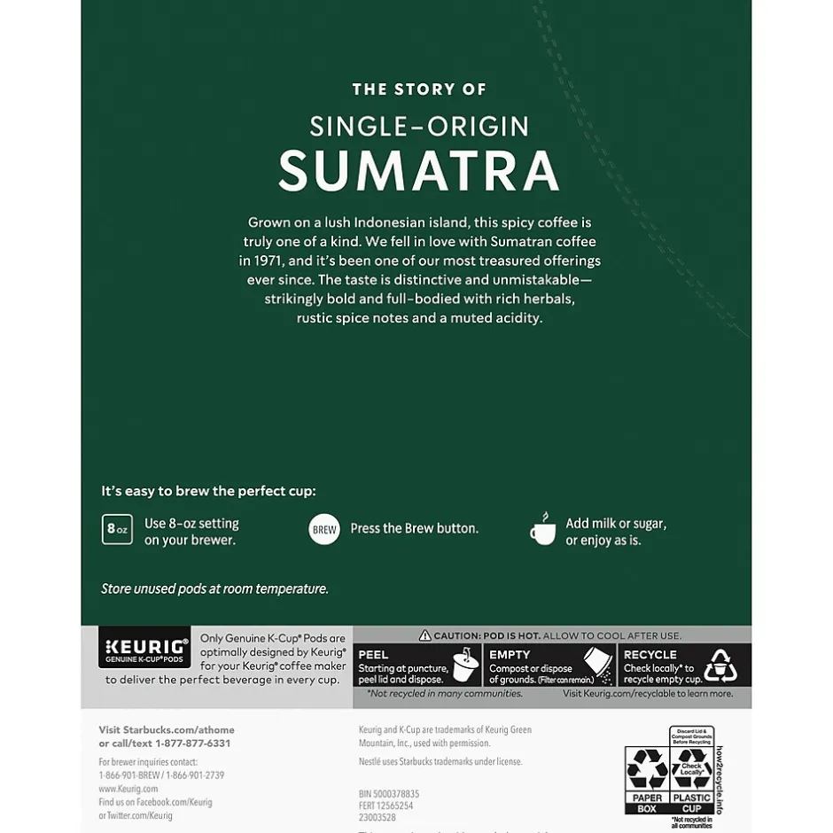 - STARBUCKS SINGLE-ORIGIN SUMATRA COFFEE—This full-bodied single-origin dark coffee has notes of rich herbs and rustic spice