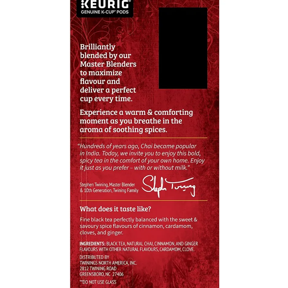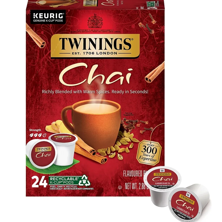 - Chai Tea K-Cup® is perfectly balanced black tea blended with sweet & savory spices. Contains 24 K-Cup® pods per box.