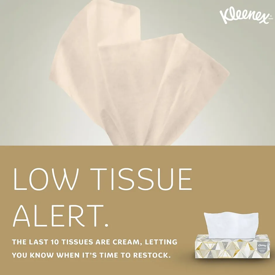 Prepare for cold, flu and allergy seasons with Kleenex facial tissue. Absorbent two-ply construction works to keep skin dry and the cheerful packaging makes a welcome addition to desks, reception areas, and exam rooms. The tissue color changes from white to yellow when the box is about to run out, so you can quickly grab a replacement from this 48-count case of Kleenex facial tissue.