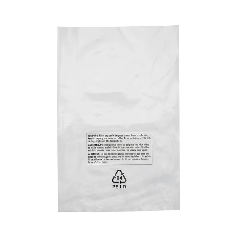 Perfect for retail and mail-order applications, this low-density polyethylene bag by Laddawn is preprinted with a standard three-language suffocation warning and recycle symbol to meet the standard shipping requirements of many online retailers.