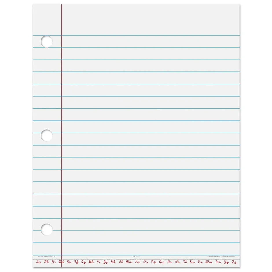 Learning Resources® Magnetic notebook paper has durable write on/wipe off surface that works with wet erase markers and measures 28″ x 22″. Notebook paper sticks firmly to magnetic boards and is used model sentences, letters or note takings.