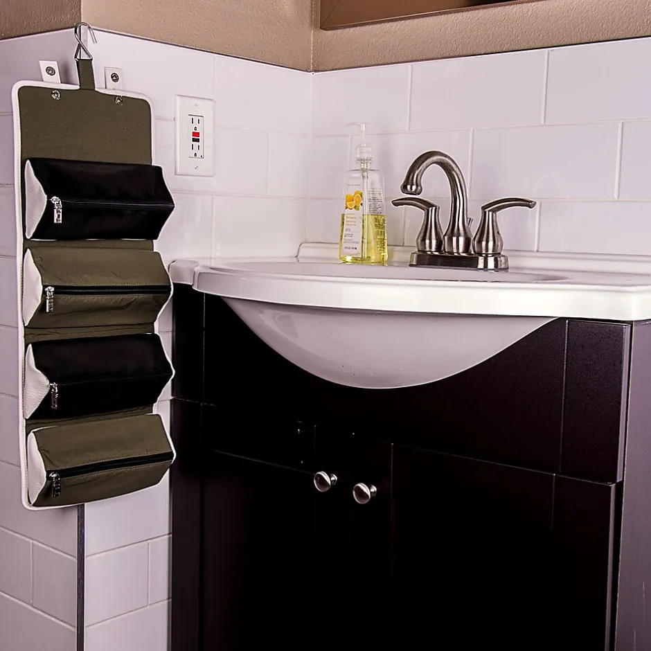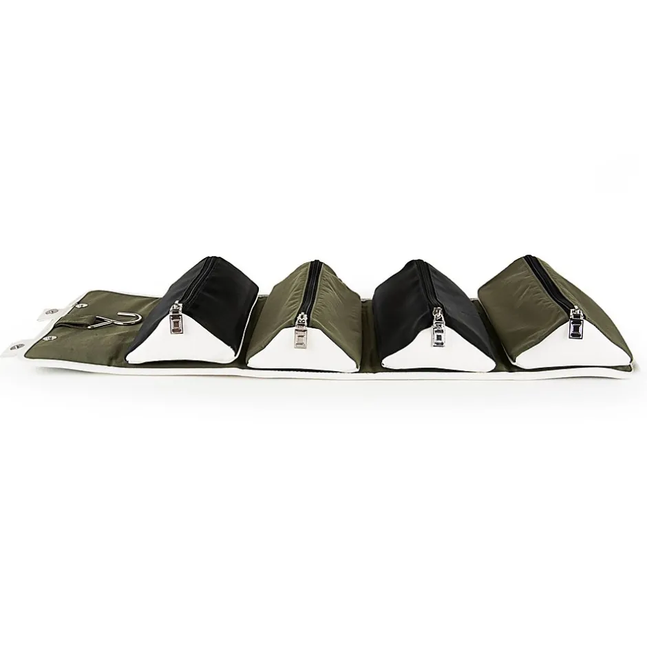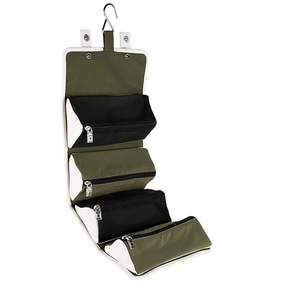 The Stowaway makes organizing a simple process. Use it for multiple end uses: travel, toiletry storage, makeup kit, cable and tech organizer, etc. Unrolling the Stowaway unveils the organizer pouches. Each pouch is removable and the exterior cover can be folded or placed flat when transporting inside other luggage. Equipped with a metal hook, the Stowaway can be hung upright. Weather resistant