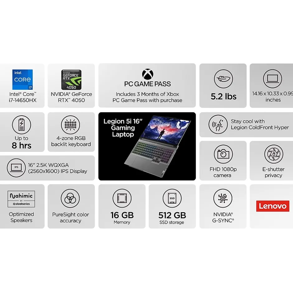 Ready to experience true immersion? Unleash your full potential on the Lenovo Legion 5. Game without compromise. Go beyond performance with an Intel Core processor. The NVIDIA® GeForce RTX™ 40 Series Laptop GPUs power the world’s fastest laptops for gamers and creators. Built for the era of AI, they deliver a quantum leap in performance with AI-powered DLSS 3 and enable lifelike virtual worlds with full ray tracing. Plus, the NVIDIA suite of technologies optimizes system performance, power, battery life, and acoustics for peak efficiency. Plus, the NVIDIA suite of technologies optimizes system performance, power, battery life, and acoustics for peak efficiency. Plus, the NVIDIA suite of technologies optimizes system performance, power, battery life, and acoustics for peak efficiency.