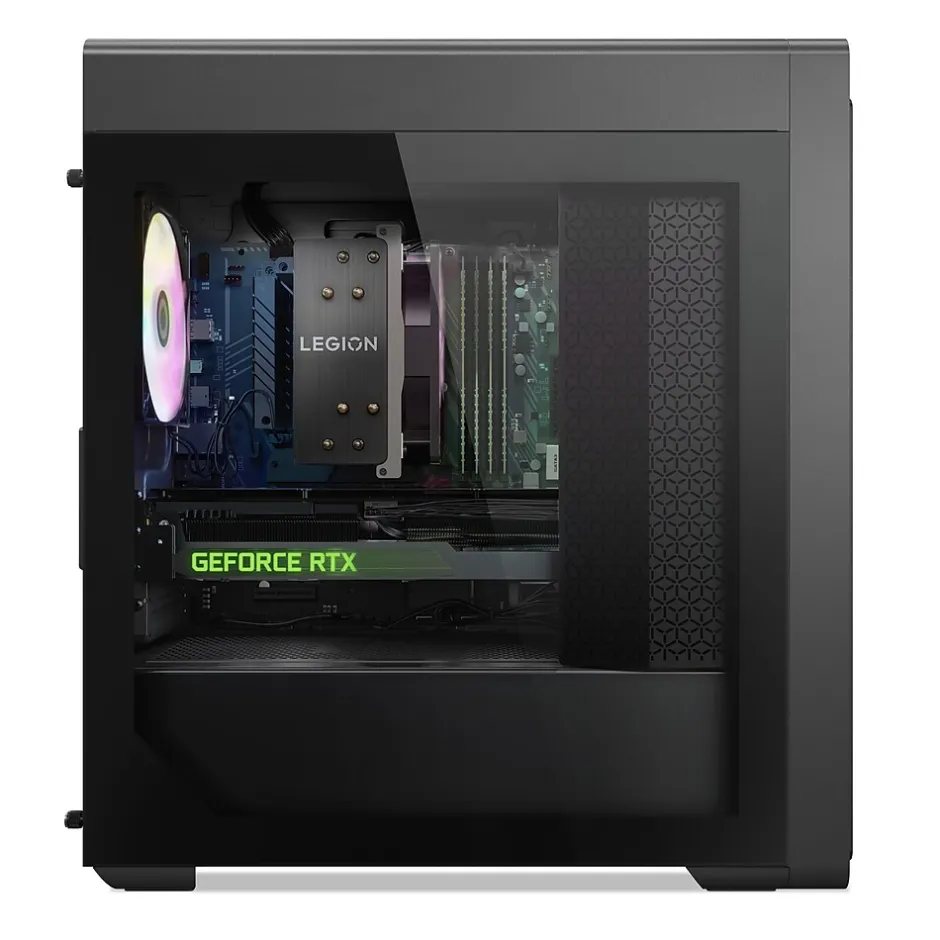 - A battle station look that meets cooling station function with the new signature Legion design language of the new Legion Tower chassis, featuring a flashy meshed front bezel that improves airflow and dampens noise. The toolless side casing includes an optional glass panel to show off your shiny internals and 12 ARGB lighting effects to match the mood of your game.
