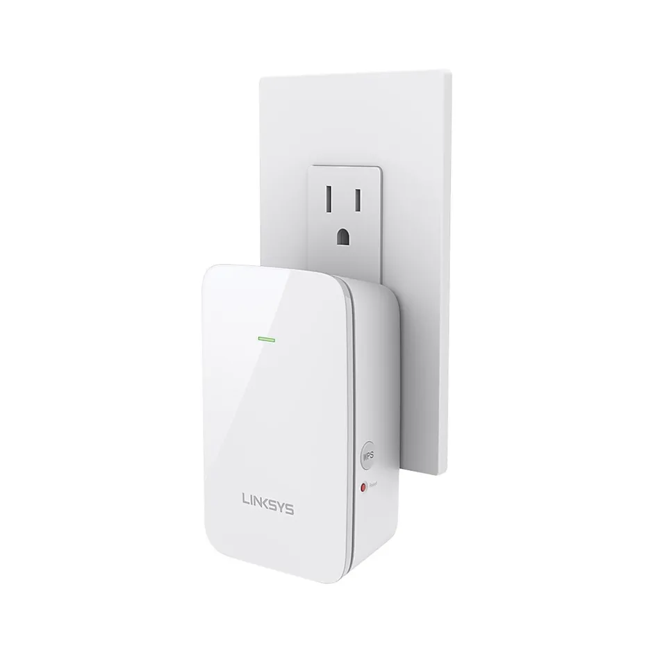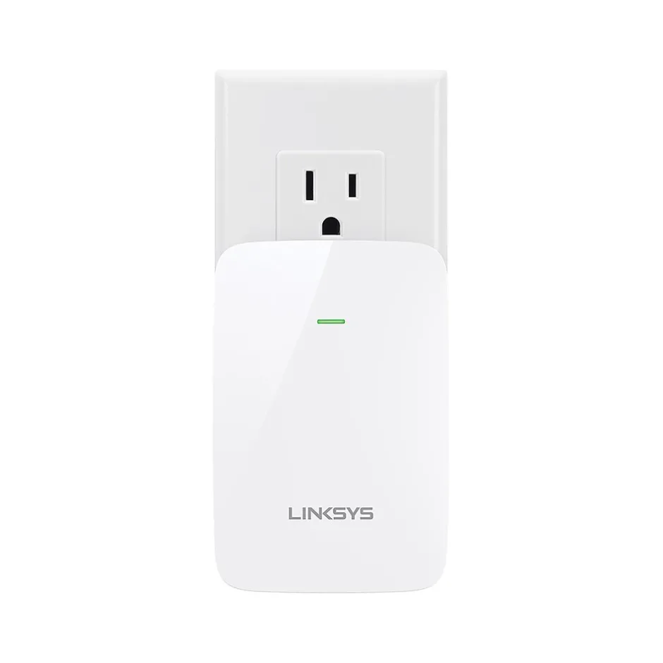Boost Wi-Fi range for better coverage and signal strength with the Linksys RE6350 AC1200 Wi-Fi range extender. Enjoy uninterrupted streaming, smooth online gaming, and more thanks to this range extender’s simultaneous wireless dual bands. The RE6350 features data transfer speeds up to N300 + AC867 Mbps and can also focus the Wi-Fi signal directly to your connected devices for optimal performance, thanks to the beamforming technology. This range extender is compatible with all Wi-Fi routers, including your existing unit or those from service providers. Crossband technology allows information to be obtained on one band and transmitted on the other, resulting in reduced dropped data packets, faster media transfer speeds, and a stronger, more consistent signal throughout your home. The RE6350 features a slim design and compact footprint: plug it into the bottom power outlet and you’ll still have access to the outlet just above it. Also, this range extender automatically receives firmware updates from Linksys as they are released, helping maintain up-to-date security.