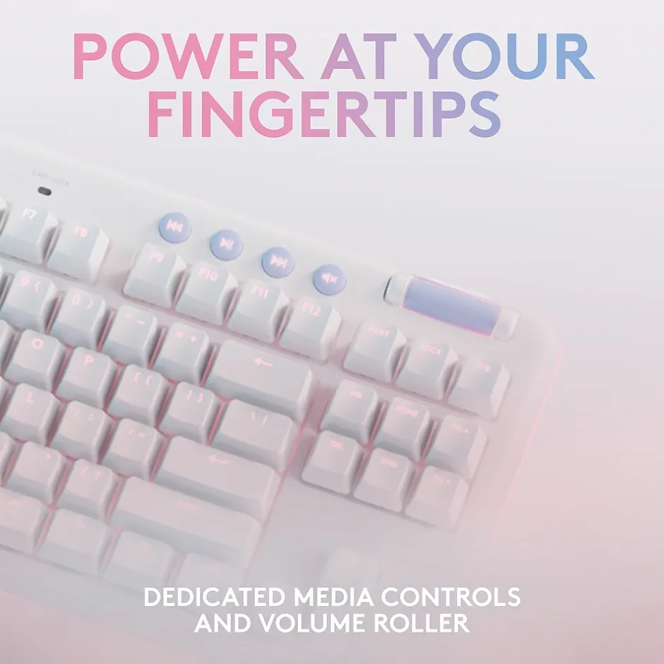 The Aurora G715 wireless gaming keyboard is a compact, comfy keyboard that delivers low-key vibes with high-key performance, so you can express yourself and play your way. Float away with the dreamy white design and cloud-soft palm rest. A compact, tenkeyless layout and adjustable height give that good game feeling, all-day long. Pack up the keyboard, place it anywhere, and play your best with a rechargeable 25-hour battery life and LIGHTSPEED wireless or Bluetooth connectivity. Show off your playstyle with ethereal LIGHTSYNC RGB on the keyboard perimeter and under the keys, along with out-of-the-box Aurora collection signature lighting.