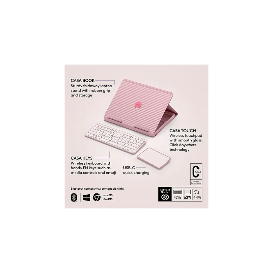 - YOUR WORK ESSENTIALS IN ONE COMPACT KIT: Logitech Casa has all you need to work from home in one compact kit, with a wireless keyboard, wireless touchpad, storage space for smaller items such as stationery and a book-like case that transforms into a laptop stand.
